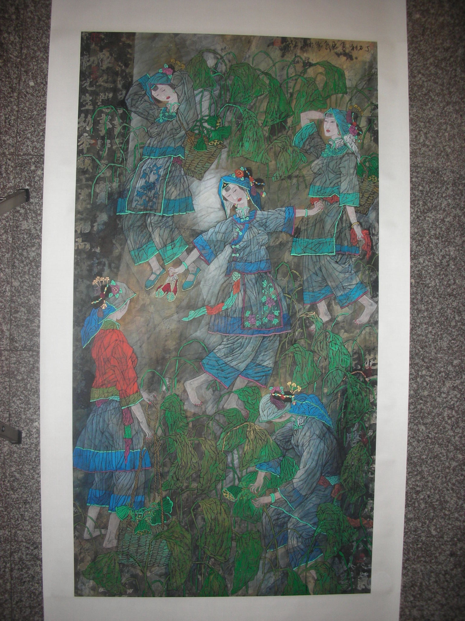 "天地悠悠,寒露为霜.荷叶田田,采莲采莲". 著录:1.北京工艺美术出版社 2003年1月出版 <<中国人物画名家技法讲座--徐惠 泉彩墨人物画艺术>>p23 贾德江主编 2.中国民族摄影艺术出版社 2003年5月出版 <<徐惠泉--彩墨人物画艺术>> p45 周钦尧主编 徐惠泉先生彩墨人物画代表作之一.出版,著录,刊载多次.