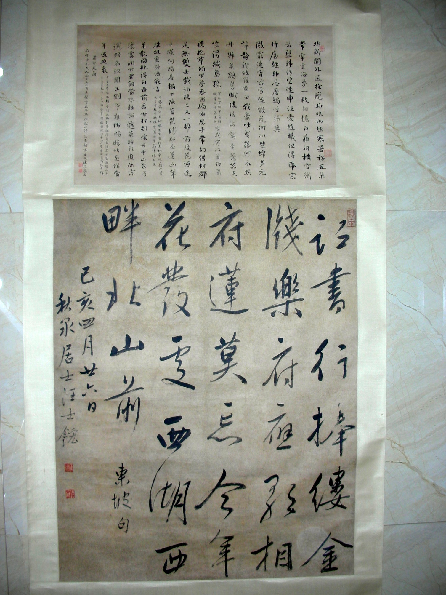 | 汪士鋐(1658-1723):字文升,号退谷,又号秋泉,长洲(今江苏苏州)人。 康熙三十六年(一六九七)会元,官中允。书法与姜西溟(宸英)称姜汪。﹝姜宸英﹞得执笔法,书绝瘦硬颉颃张照,诸子莫及。曾题沈凡民印谱自谓初学停云馆麻姑仙坛、阴符经,友人讥为木板黄庭,因一变学赵得其弱,﹝赵孟瞟{再变学褚得其瘦。﹝褚遂良﹞晚年尚慕篆、隶,时悬阳冰颜家庙碑额于壁间,﹝李阳冰﹞观玩摹拟而岁月迟暮,精进无几。其书能大而不能小,然有奇势,纵横自放,而分间布白,无分寸失。名公卿碑版多出其手。著瘗鹤铭考、秋泉居士集、全秦艺文志。卒年六十六。《书林纪事、履园丛话、昭代尺牍小传、论书帖》 翁方纲诗有「楷法同时汪与何」,自注「汪谓退谷中允」,何乃何焯也.(复初斋诗集卷12‧院之东厅,康熙乙未秋长洲何义门学士书联云「仪凤祥麟游集盛,金书玉字职司勤。」字画遒劲,方纲摹而重锓之,记以四诗)。 陈廷庆(1754-1813) 清代诗人。字兆同,号古华。上海奉贤人。乾隆四十六年进士,改庶吉士,授编修,历官辰州知府。嘉庆九年主蕺山书院。工诗古文辞,所至皆有诗,亦善书法。精鉴赏,富收藏。有《谦受堂全集》30卷、《古华诗钞》等。 |
